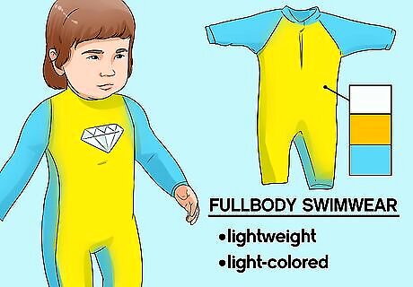 Dress your baby in full-coverage UV-protected swimwear. Babies have thin skin that is vulnerable to the sun. Use swimsuits, rash guards, and hats with UV-protection built in. You can buy UV-protected swimwear wherever swim or beach gear is sold. You can also get it online. Look for swimwear and clothing that states it has an ultraviolet protection factor (UPF) of 30 or higher.