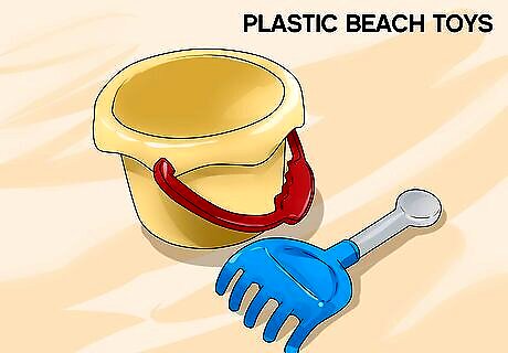 Have some plastic beach toys on hand. Your little one may be too enthralled with the ocean and the sand to pay attention to toys, but bring along a few just in case. Bring some brightly colored plastic beach buckets and baby-friendly toy shovels so they can dig in the sand. Bring along their favorite plastic truck or ball that they push around over the sand dunes. Avoid bringing stuffed animals and toys that squeak. Sand may get stuck in the plush toy’s fabric, and a squeaker may suck some sand inside the toy.