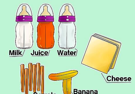 Bring water and snacks. Pack a cooler with your baby’s favorite snacks and drinks. Bring along bottled milk, water, or juice to keep your baby well-hydrated throughout the day. Opt to take some portable, pureed baby food packets so your baby can enjoy an easy snack. Take along healthy finger foods like carrots, bananas, or pieces of cheese if your little one is eating solid foods. Find a shady spot that isn’t in a windy area to breastfeed your child at the beach. Bring clean, lukewarm water to the beach with you. This will be useful to use as a rinse if your baby gets sand in their mouth or eyes.