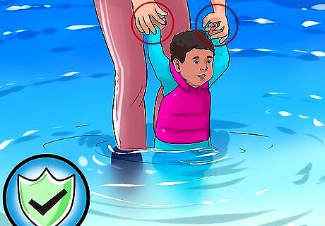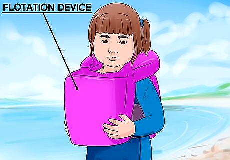 Dress your baby in a flotation device. Make sure your baby is wearing a flotation device at all times when they are near the water. Although it may be uncomfortable for your child at first, they will get used to it over time. A wave could knock them over as you are holding on to them, or a current could pull them out. Make sure your baby will be able to keep their head above water at all times by placing them in a snug life jacket. Make sure the life jacket has head support and a strap between the legs. This strap will prevent the jacket from slipping off over the baby’s head.