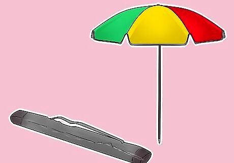 Pack an umbrella. Using a large beach umbrella is a great way to shield your baby from the heat and the sun’s harmful rays. Make sure to use a light-colored umbrella that will reflect the heat. This space will provide a cozy, shady area for your baby to play in the sand. Take along a smaller umbrella that you can easily clip onto your baby’s stroller.