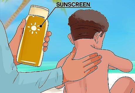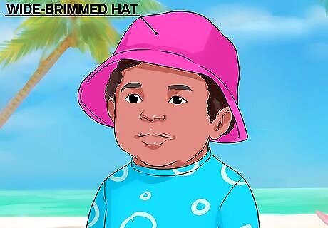 Put a wide-brimmed hat on their head. It is important to keep your baby’s head covered during a day at the beach. Even if they have hair, the top of their head can still burn. Use a wide-brimmed hat to protect their heads and shield their eyes from the sun’s glare.