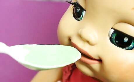 Feed baby food. If you have a Baby Alive Sweet Spoonfuls doll, you can feed the doll with food made just for her and she will "poop". These dolls are great if you are ready to have a "real" baby.