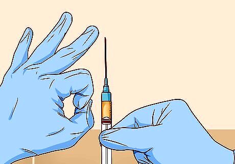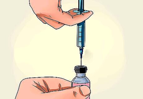 Remove air bubbles from the syringe. Turn the bottle and syringe upside down, then pull the plunger to fill the syringe with the solution. Push the plunger to expel the solution back into the bottle and remove air bubbles from the syringe.