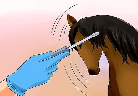 Inspect your horse’s incisors. An adult horse has 6 upper and 6 lower incisors at the front of the mouth. To inspect them, peel the upper lid up and lower lid down. Look from directly in front of the horse, and then from both the left and the right hand-side. In profile, the biting edge of the teeth should meet in a smooth line. The enamel surface should be free from cracks and the teeth firm in the head, not loose or wobbly. There should be no swelling or change of gum color where the crown meets the gum. There should be no discharge coming from around the gum line.