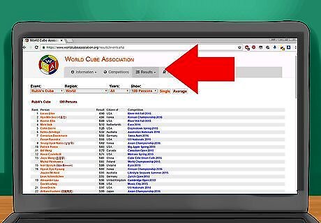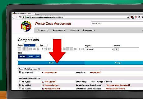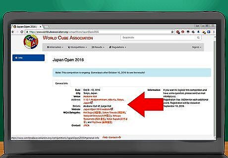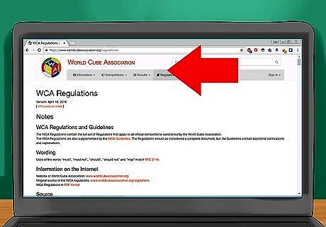 Register for the competition. When registering, you'll need to choose events to compete in. After you choose the events, you'll usually need to pay a registration fee, either online or at the door of the venue for the competition. Here is a list of all WCA events (note that usually not all these events will be held at a single competition): 3x3 speed solve - Competitors solve a 3x3 cube as quickly as they can. 2x2 speed solve - Competitors solve a 2x2 cube as quickly as they can. 4x4 speed solve - Competitors solve a 4x4 cube as quickly as they can. 5x5 speed solve - Competitors solve a 5x5 cube as quickly as they can. This is the first big cube event. 6x6 speed solve - Competitors solve a 6x6 cube as quickly as they can. This is a big cube event. 7x7 speed solve - Competitors solve a 7x7 cube as quickly as they can. This is a big cube event. 3x3 One-Handed (OH) - Competitors solve a 3x3 cube as quickly as they can with only one hand. 3x3 Blindfolded (3BLD) - Competitors memorize a 3x3 cube and solve the cube blindfolded as quickly as they can (memorization time included). 3x3 Fewest Moves - Competitors have 1 hour to come up with a solution to the 3x3 cube in as few moves as possible. 3x3 with Feet - Competitors solve a 3x3 cube with their feet as quickly as they can. Square-1 - Competitors solve the Square-1 puzzle as quickly as they can. Pyraminx - Competitors solve the Pyraminx as quickly as they can. Skewb - Competitors solve the Skewb as quickly as they can. Megaminx - Competitors solve the Megaminx as quickly as they can. Rubik's Clock - Competitors solve the Rubik's Clock as quickly as they can. 4x4 Blindfolded (4BLD) - Competitors memorize a 4x4 and solve it blindfolded as quickly as they can. 5x5 Blindfolded (5BLD) - Competitors memorize a 5x5 cube and solve it blindfolded as quickly as they can. 3x3 Multiple Blindfolded - Competitors memorize multiple (their own choice of a number of cubes) 3x3 cubes and solve them all at once blindfolded. The goal is to get as many cubes solved in the shortest time possible.