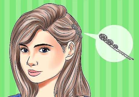 Place rhinestone hair pins or combs in your hair. If you wear your hair down during the day and want to keep the simple style for a night out, adding a few rhinestone hair pins or a decorative comb to your hair can dress up your look. Use a couple of pins or a comb to pull back a small section of hair on the side of your head, or tuck your hair behind your ear and pin it in place. You can pin back the hair on 1 side or both, depending on the look you prefer. In addition to rhinestone pins or combs, you can also use a flowered style. Use the accessories to push the hair back behind your ear on one side to mimic the look of having a flower tucked behind your ear. You can also use rhinestone hair pins to dress up an updo. Use them to pin up a bun, French twist, or other style.