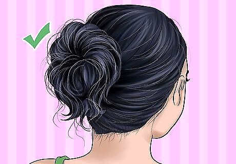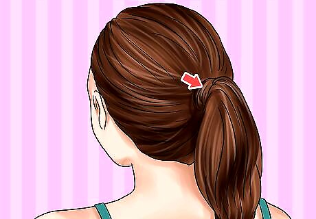 Gather your hair in a low ponytail at the nape of your neck. Once you've boosted the volume at the crown of your hair, pull your hair back into a ponytail. Make sure to keep the ponytail low at the nape of your neck, and secure it with a hair elastic. You don't have to worry about the hair elastic matching your outfit because it won't be visible when you're done styling your hair.