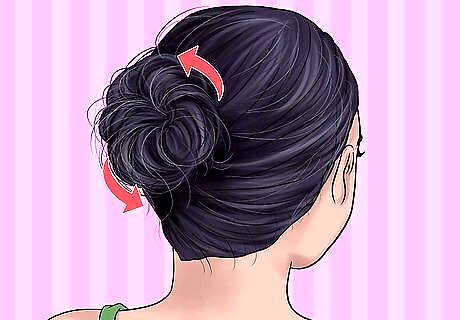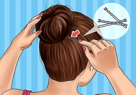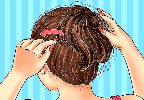 Spread the hair out to and pin in place. When you've rolled the hair all the way back toward your head, use your fingers to spread it out neatly to cover the twisted portions of hair around the elastic. Use several bobby pins to secure the hair in place for an elegant updo that's perfect for an evening out. If you want to add extra details to your evening hairstyle, gather some hair from the sides of your head, twist them slightly, and pin them in place on either side of the updo. You can spray your updo with a flexible hold hairspray to ensure that your style lasts all evening.