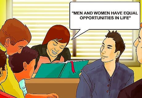 Read your students a statement of opinion. Ask your students to pick a side in response to your prompt. Then ask them to move to opposite sides of the room, depending on which side they agree with. For example, read a statement like “Men and women have equal opportunities in life.” Then ask your students who agree with the statement to line up on one side of the room and those who disagree to line up on another side.