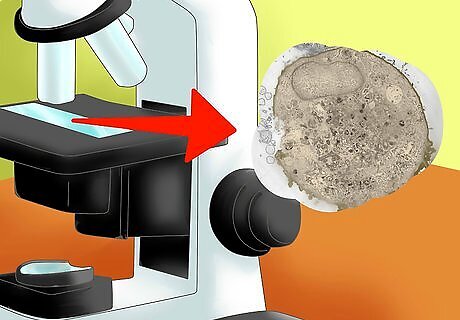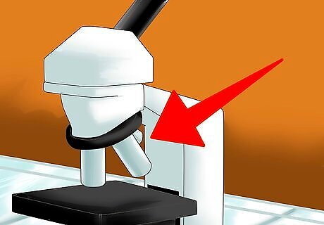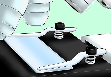 Place your specimen slide on the microscope stage (the platform that holds the slides). Some microscopes will have stage clips that allow you to secure the slide in place to prevent movement during focusing and viewing. If there are clips on the stage, gently push the slide underneath to secure in place. If no clips are provided, place the slide directly under objective. Be careful when pushing slides underneath the clips. Too much force can damage the slide. You may have to move the slide while looking through the eyepiece to find the desired area of the specimen.
