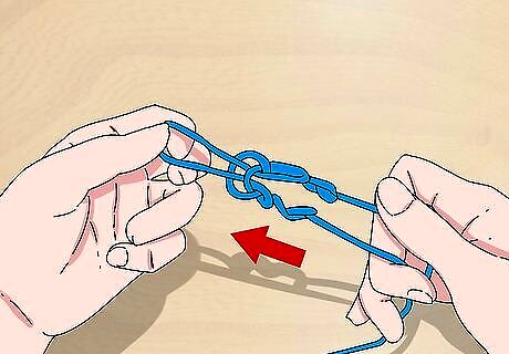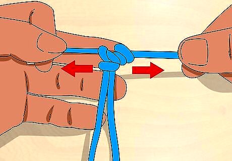 Slide the two looped sides of the knot together and finish tightening. As you continue to tighten the dropper knot, the two sides of the knot will slide together and meet in the middle. Tug on all of the individual portions of the line to make sure that the knot is tight. See that the looped portions of the line do not overlap; keep them separately layered as the knot tightens. If you’re struggling to tighten the knot, try this trick. Hold the loop in your mouth and one side of the line in either hand. Then slowly tug on both sides of the line, and the knot will come together.