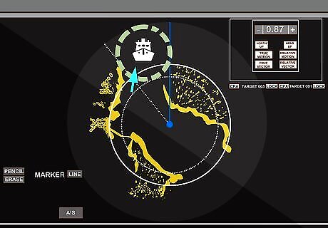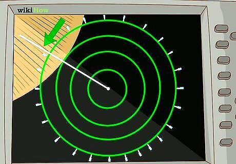 Identify masses on the radar that aren’t land. Any solid object in the water will show up on your radar. Landmasses and objects will show up as a solid color and are usually very large. Ships or boats that are moving will also move on your radar and will look like an oval or small circular dot. Identify which colors are land and which dots are ships or other objects in the water. Look out around the boat and try to visually identify large land masses and objects such as other boats, and try to relate them to what you see on your radar. Some radars have an overlay system that you can use to see a land map layered over your radar.