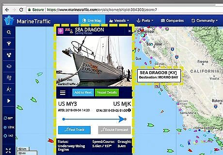 Look at a specific part of the map if you aren’t tracking a specific ship. If you just want to look at the headings and locations of different vessels, you don’t have to specify the name of a ship. Drag your cursor to the area on the map that you want to look at and examine the ships in the area. For example, if you want to see all the ships currently off the coast of California, click and drag the cursor across the map until you can see the ships off the California coast.
