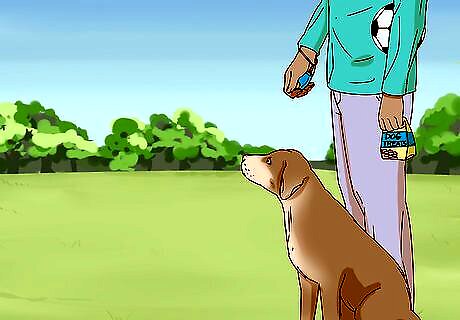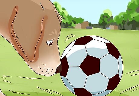 Train your dog to identify a target. Before training your dog to play soccer, teach it how to identify a target. Place 1 of your hands in front of your dog’s face with your palm flat and facing the dog. When your dog sniffs your hand, click the clicker and give your dog a treat with your other hand. Repeat this at least 3 times to reinforce the behavior. Then, begin moving your hand to either side and up and down to train your dog to find the target in a different location. Click and reward your dog each time it sniffs your hand. Clicker training relies on exact timing. Click the moment your dog performs the desired behavior. When you teach your dog to play soccer, the ball will be the target.