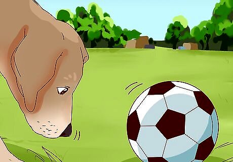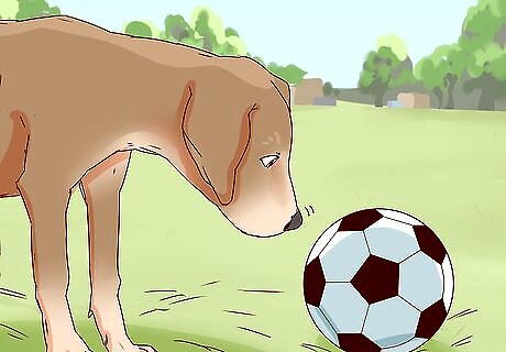 Reward your dog for showing interest in the soccer ball. Use a dog-proof soccer ball or an old one that you won’t mind if it gets ruined. Start by rewarding your dog for looking at the ball. If your dog refuses to look at the soccer ball or is more interested in getting treats, roll the ball to get your dog to focus on it. When your dog targets the ball, click and give it a treat. It's very important to keep the ball under your control at all times. To that end, avoid letting your dog play freely with the ball during training.