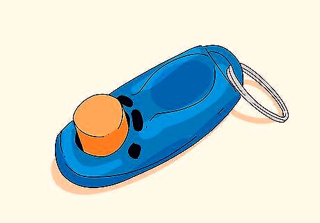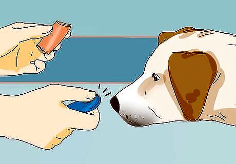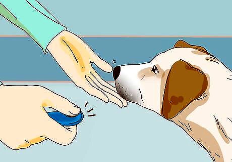 Purchase a clicker at a pet supply store. A clicker is a hand-held dog training device that, when pushed, makes a "click" sound. When your dog performs the desired behavior, you press the device. Then, you reward the dog with a treat. Your pet will learn to associate that behavior with rewards. Pressing the clicker when the dog performs a behavior is much more effective than saying "Good dog." This is because a clicker has a distinctive and unchanging sound and the dog hears the sound at the exact moment a behavior occurs.