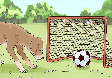 Take your dog to a distraction-free area. Dogs get distracted easily, so choose a quiet place like a basement, fenced backyard, or local athletic field after practice. Avoid playing in busy places, like at a park full of kids or other dogs. All you need is a soccer ball, a soccer goal, small treats, and the clicker.