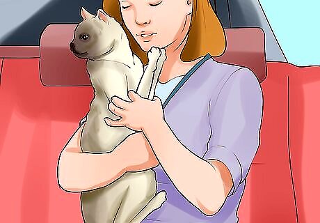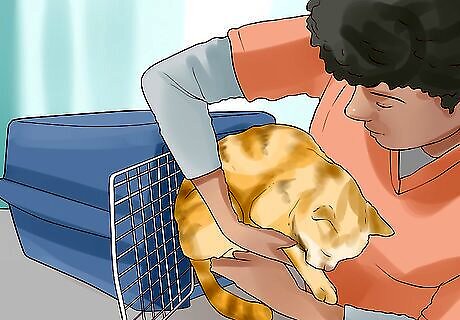 Hold the cat properly. If your cat does not freely enter the crate on the day of travel, place the crate on its end with the door facing toward the ceiling. Pick up your cat with one hand holding his or her front legs as the other hand supports the bottom.