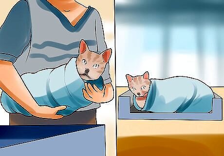 Grab a towel. If an emergency arises and you do not have a crate or a harness to transport your cat, wrap your cat gently with a towel. Wrapping a nervous cat in a towel can help prevent injury to both you and your cat, as well as help the cat feel safe and secure.