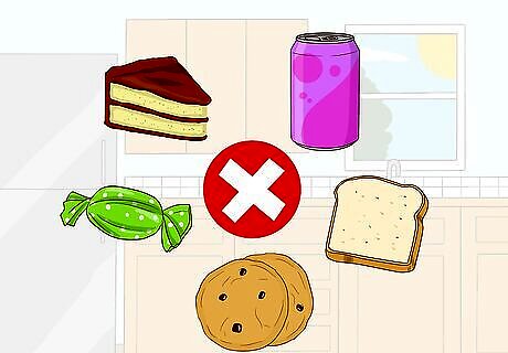 Eliminate sugar from your diet. There is some evidence that eating too much sugar—especially glucose—can cause an overgrowth of yeast in your body. You may be able to reduce your risk of getting yeast infections by cutting back on foods that contain sugars and refined carbohydrates, such as: Candy Cookies, cakes, and pastries Sugary beverages such as sodas, fruit drinks, and sports drinks White bread, rice, and pasta