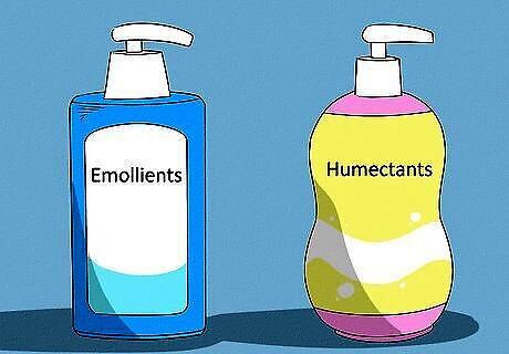 Choose a moisturizer. Moisturizing your skin is essential for treating cracked and callused hands. You will want oil-based, alcohol-free emollients and humectants that will lock in moisture like ointments and creams. Avoid water-based moisturizers which aren’t very effective, such as lotions. Emollients are basically skin lubricants that feel slippery, soften skin and help make it smooth and pliable. Emollients might contain lanolin, mineral oil, jojoba oil, isopropyl palmitate, propylene glycol linoleate, squalene or glycerol stearate as an effective ingredient. Humectants use the moisture in the air around you to increase your skin’s water content. Effective humectants include glycerin, hyaluronic acid, sorbitol, propylene glycerol, dimethicone, urea or lactic acid.