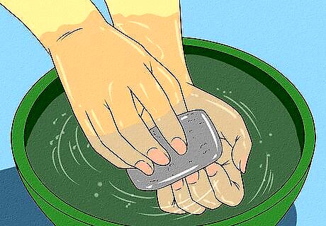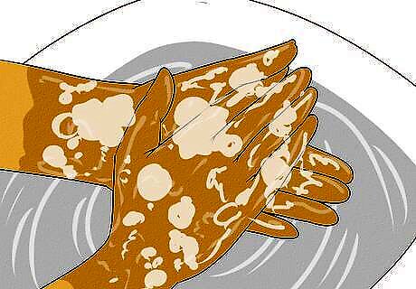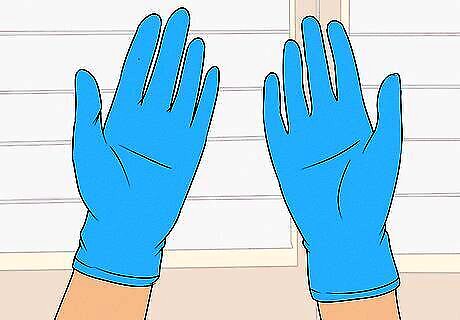 Wear rubber, vinyl or latex gloves. Gloves will protect your hands when being exposed to drying detergents and chemicals, such as while washing dishes or cleaning bathrooms. Even just dipping your hands in plain water repeatedly can be irritating to your skin, so wear gloves when you do that as well. You can purchase gloves from your local grocery or general store. If you wear vinyl gloves, they can also protect your hands from coarser materials that could damage skin. Some people are allergic to latex. To be safe, you may want to avoid latex gloves. Don't forget to also wear cotton-lined gloves outside to protect your hands from the drying cold winter weather.