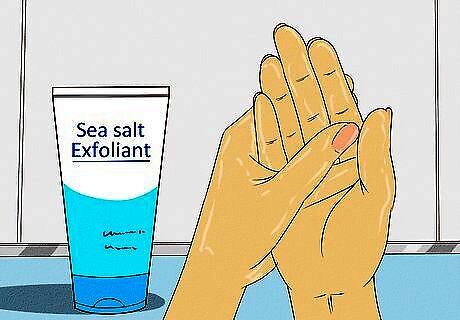 Use an exfoliant. You can purchase a body exfoliant or one meant for your hands—a sea salt exfoliant is highly recommended. Use the exfoliant once a week to scrub off dead skin and keep the skin from thickening. Remember to be gentle on your hands, especially if they easily become dry and cracked. You can also make a scrub for your hands. One way is to grind about 1 cup of uncooked oats into a fine powder and rub the skin of your hands with the powder. Make a sugar-lime paste by combining sugar and lime juice until you get the consistency of an exfoliant or paste. Massage the mixture into your skin. Leave it on for about a minute and rinse. The sugar exfoliates the skin on your hands while the lime juice evens skin tone.