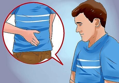 Pay attention to pain. Although symptoms of stomach ulcers can vary from person to person, pain is a common symptom. You may have pain in the area just below your rib cage near the center of your chest. In fact, you might notice pain anywhere from your belly button up towards your breastbone. Don't be surprised if the pain comes and goes. It might be worse at night, if you're hungry, or it may go away and return weeks later.