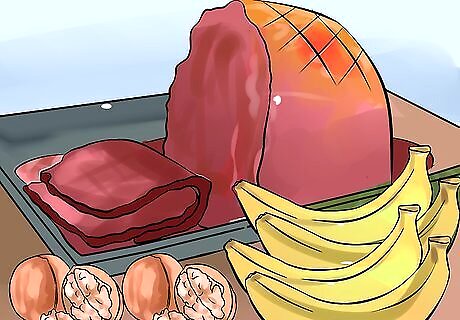 Add more vitamin B6 to your diet to increase progesterone levels. Vitamin B6 is essential to maintaining adequate levels of progesterone in your body. B6 functions by breaking down excess estrogen in the liver to create hormonal balance. Whole grains, walnuts, lean red meat, seafood, bananas, potatoes, beans, spinach, and fortified cereals are all examples of foods rich in vitamin B6. The recommended dose of vitamin B6 is 1.3-1.7 mg per day for adults.