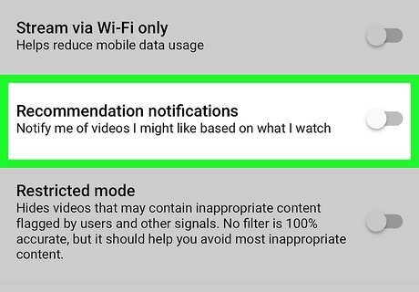 Slide the Recommended notifications switch to Android 7 Switch Off. This will stop YT Music from sending you notifications, and recommend videos you might like. If you also have the YouTube app installed, you'll still receive other notifications from it.