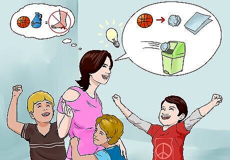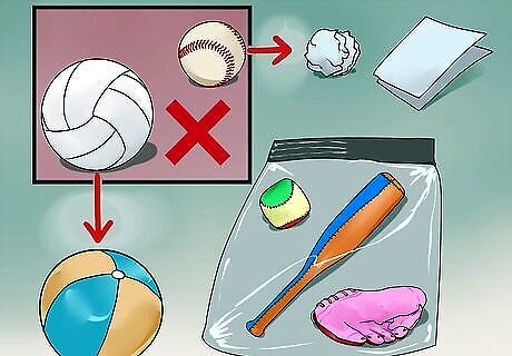 Replace hard balls with softer balls. Harder balls, like baseballs, can be replaced with softer variations to prevent damage to the things inside your house. Consider replacing hard balls with balls that would be safer for indoor play, such as beach balls, balloons, or bean bags. Many toy companies sell softer, lighter variations of outdoor balls marketed towards younger children. Even a crinkled piece of paper can double as a makeshift basketball.