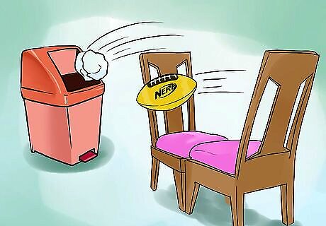 Get creative with your furniture. Furniture can represent different things if you use your imagination. For instance, if you're playing soccer inside, you can clear out a room and use two pieces of furniture to represent goal posts. Likewise, two chairs can become the goal posts for a game of nerf football. Think of other things that you can do with the items laying around in your house. Be very careful when incorporating things into your indoor play. Don't pick anything that can easily get knocked over or shatter. A trash bin can become a basketball hoop. Furniture can become cover in a nerf gun fight.