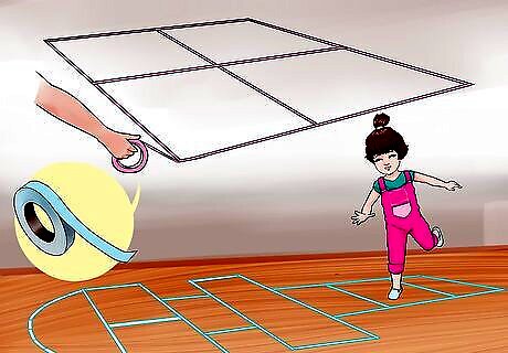 Play hopscotch or foursquare. Games that require chalk to play, like four square or hopscotch, can be played inside using painter's tape. Instead of drawing the grid on the blacktop with chalk, use painters tape to draw a grid on hardwood or tiled floors. Once the kids are done playing, you can remove the tape, and it will be like it was never there.