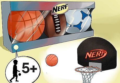 Get mini indoor versions of popular sports. Toy companies like Nerf produce small indoor basketball hoops. These hoops can be attached to a wall or the back of a door. Other indoor sports equipment include small soccer or hockey nets. Look online or go to the store and compare brands. Most indoor equipment will come with age suggestions on the packaging.