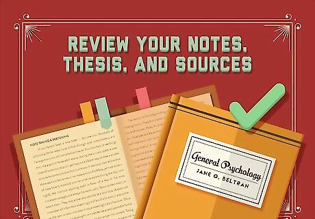 Review your notes, thesis, and sources. After you’ve organized your notes and sources to match your outline, go over and check to make sure everything is reputable and that you have enough resources to support your thesis. Check the accuracy of your research and verify that all of the information is factual and up-to-date. Especially if your research paper is on a current topic. You may find through fact checking that you come across a new or central idea that helps you better discover the central topic of your paper. Reading over all of your notes once again before you begin typing up your paper will also help you to learn the information better, allowing you to concisely communicate your point of view. Read over your thesis one more time, making sure that it still applies to your research and answers the question of the assignment. You may find that you have to tweak it a bit.