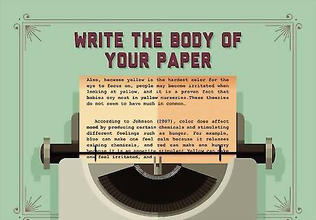 Write the body of your paper. Begin the first body paragraph on the next line after your introduction. Indent the first line with the tab key again. In a lot of standard research papers that you will write in school, you will have three body paragraphs as three supporting arguments. Flesh out your outline. Your outline is the skeleton of your paper and already has your arguments, sources, and examples laid out. For your body paragraphs, go through this outline and flesh out these points into narrative arguments, and examples that your reader can follow. Go back to the notes you have organized and use these to find quotes, data, statistics, and any other information which you can include to expand your writing. Expand your information to back up the arguments and points you expressed in your outline. It’s also a good idea to get each paragraph peer edited several times, and once by your teacher before your final draft. Your peers and teacher will provide another pair of eyes which can help you fill in any gaps or show you where you may be going off topic; as well as checking for spelling and grammar. When citing sources or using quotes in your paper, you must immediately include the proper citation for reference. If citing a text with an author, you can either include the author’s name or a reference number which corresponds to a source in your Works Cited or References page. Include the name or number in parentheses after your sentence, but before the period. If you are quoting an author, introduce the quote with a phrase that provides the author’s last name and the date of the publication. Put the date in parentheses. Then begin your quote. After the quote, reference the source by page number if you found the quote in a book. According to Jones (1998), "Students often had difficulty using APA style, especially when it was their first time" (p. 199).