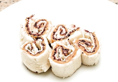 Roll the sandwich into pinwheels. You can make peanut butter and jelly sandwiches more fun by simply rolling them up into pinwheels. Trim off the crusts and discard them. Use a rolling pin to lightly flatten the sandwiches, so they're easier to roll. Tightly roll the sandwiches and then cut them into slices. Try sliding several of the pinwheels onto skewers so you have peanut butter and jelly kebabs. These make great snack food.