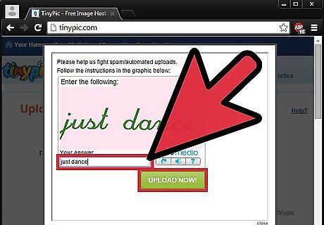 Complete the CAPTCHA. Follow the instructions provided by entering the text shown into the text box right underneath. Press UPLOAD NOW! to submit. Click the arrow button to load new text. You can opt for audio captcha by clicking the sound icon.