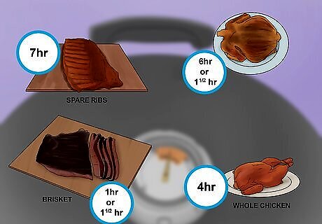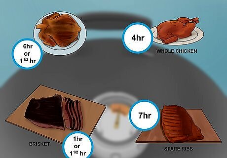 Set a timer and let the food smoke in the smoker. The length of time you should let the food smoke depends on the kind of food you’re cooking and how big it is. Some general smoking times for different foods at 225-250°F (107-121°C) are: Spare ribs: six to seven hours. Brisket: one and a half hours per pound. Whole chicken: four hours. Whole turkey: six and a half hours.
