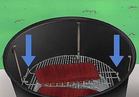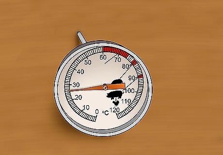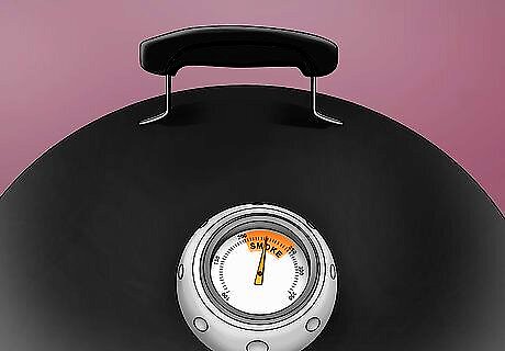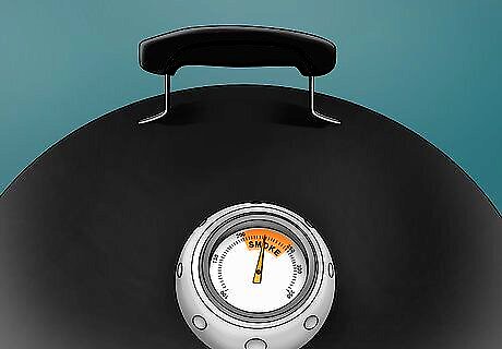 Keep the smoker heated to around 225-250°F (107-121°C). Check the temperature using the thermometer on the lid of the smoker. If your smoker doesn’t have a built-in thermometer, stick a cooking thermometer through one of the vents in the side of the smoker to check the temperature. Check the temperature every 30 minutes to make sure it’s staying in the right range. If the smoker is too hot, try shutting the vents and adding ice cubes to the water bowl. You may need to remove some of the charcoal to get the temperature down. If the smoker is too cold, open the vents and add more charcoal.