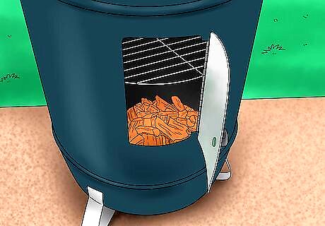 Use a chimney starter to light charcoal for the smoker. Set the chimney starter on the metal grate at the bottom of the smoker (under the water bowl). Slide a piece of newspaper under the chimney starter and fill the starter to the brim with charcoal. Use a long lighter to light the newspaper under the starter, which will ignite the charcoal. Let the charcoal burn for 10-20 minutes. Use a pair of grilling mitts to grab the handle on the chimney starter when you're ready to dump the charcoal out. Dump the charcoal on the grate at the bottom of the smoker.