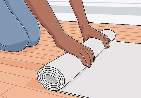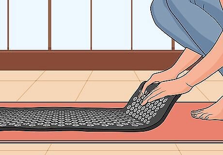 Drape a yoga mat on a flat, sturdy surface. Find some open space in your home that’s large enough to fit your acupressure mat, like your bedroom or hallway. Check that your yoga mat is larger than your acupressure mat, as the acupressure tool will be going on top. If you don’t have a yoga mat, feel free to use a large blanket or towel instead.