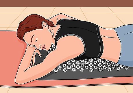 Lie on your stomach after a tough workout. Slowly lower yourself stomach-first onto the acupressure mat. Drape and tuck your arms beneath your head and neck, so you can be as comfortable as possible. Try to center your chest and abdomen over the spikes as you do this. This position may also help with circulation, as well as digestion.