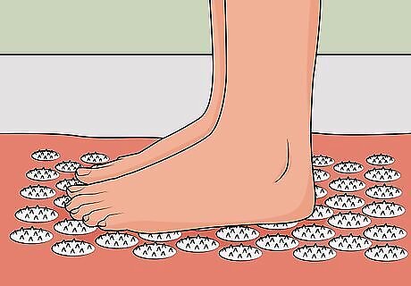 Relax your feet by placing them on your mat or pillow. Sit on a comfortable chair and rest your bare feet on the acupressure mat or pillow. As you relax, cushion your face with your arms. Rest in this position for 10 to 20 minutes, depending on your own comfort level. This is a great option for people who are on their feet all day. You can also stand on the mat, too.