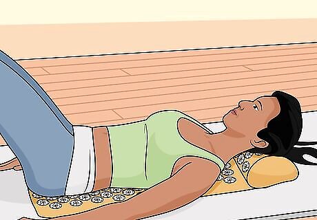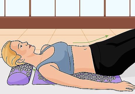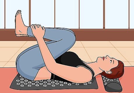 Tuck in your knees to relieve pain in your lower back. Bring your knees up and pull your heels in, dragging to the edge of your bottom. Keep your legs in this position each time you relax on your acupressure mat, as this helps the plastic spikes target your lower back. You can always lay flat on the mat as well, but this is the best way to target certain parts of your back.