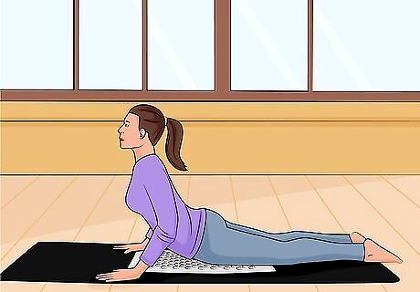 Rest on the mat in the cobra position to soothe your quads. Lay face-down on your acupressure mat, then lift your upper body with your arms to create the cobra position. Focus on creating a gentle curve with your back, centering your thighs and groin area on the mat. This is a great way to wind down after a tough workout. You can also use this if you’re dealing with some muscle pain.