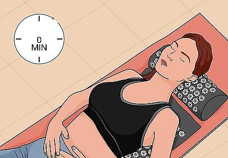 Set a timer or alarm for 20 minutes so you can adjust to the mat. Set a cooking timer or your phone for around 20 minutes, so you can monitor how long you use the acupressure mat. If you’re using the mat for the first time, you may want to set your timer to around 10 minutes. As you get acclimated to the mat, you can set the timer to 20 minutes instead. You can set your timer for up to 40 minutes.