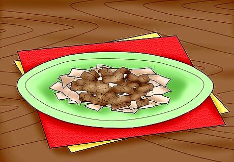 Bake lasagna chips or crackers. Leftover lasagna noodles can easily be turned into tasty crackers or chips. To begin, cook the noodles and lay them out flat on a cutting board. Then, cut them into cracker-sized pieces. Then: Put the pieces on a baking sheet covered with parchment paper, add any seasonings you like, and bake them at 375 degrees F (190 degrees C) for 8 minutes. Check the noodles after 8 minutes. Recheck them every 2 minutes if they are finished. Remove the noodles when they are slightly puffy, look crisp, or are starting to brown.