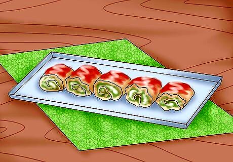 Create mini-lasagna roll-ups. Mini-lasagna roll-ups are a simple and tasty appetizer you can serve at a party or just to your family. Set your oven to 350 degrees Fahrenheit (177 degrees Celsius). Then: Boil, drain, and dry your lasagna before laying them on a cutting board. Combine your spinach, ricotta, parmesan, garlic, and your choice of seasonings in a bowl. Feel free to substitute any ingredient. Cooked chicken or sausage might also be a good addition. Cut the lasagna pieces in half widthwise and place two tablespoons of your filling mixture onto each piece of lasagna. Make sure you have an inch of space on one side. Roll the noodles. Make sure you end on the side of the noodle with the empty inch. Place your rolls into a baking dish and cook them for 15 to 20 minutes.